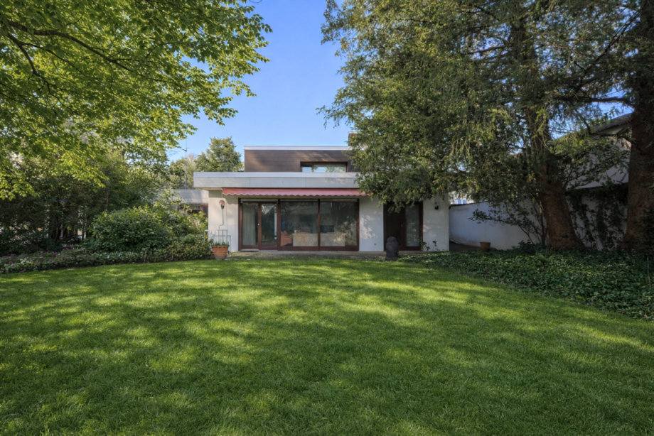 o Einseitig angebautes Flachdach-Stadthaus, Doppelgarage, eingewachsener Garten